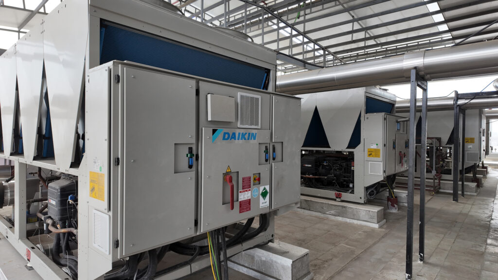 Tesisin tüm iklimlendirme altyapısı, üretim süreçlerinde gerekli olan sıcaklık ve hava kalitesi hassasiyetini en yüksek standartlarda karşılayacak şekilde tasarlandı. Daikin’in ısı geri kazanımlı klima santralleri enerji verimliliği sağlarken, hava soğutmalı invertörlü vidalı soğutma grupları fabrikanın yüksek kapasite gereksinimlerini güvenle karşılıyor.